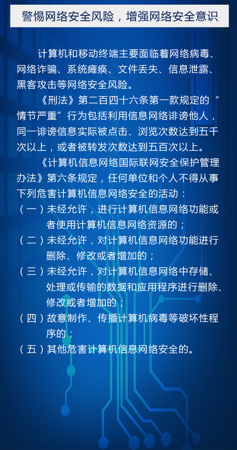 可是,你想到过吗,使用计算机网络也面临着计算机病毒、黑客攻击、网络诈骗、文档丢失、个人信息泄漏等危险和危害。为了帮助大家提升网络安全防范意识、提高网络安全防护技能、遵守国家网络安全法律和法规,共同维护、营造和谐的网络环境济源职业技术学校 ,网络与信息中心特编纂了网络安全知识图画,针对常见的网络安全问题,提供了一些简便实用的措施和方法。