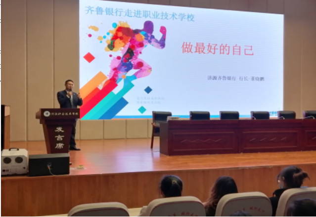 董行长在银行系统工作十余年,是齐鲁村镇银行总行特聘讲师,人民大学工商管理硕士,带领的济源行连续两年入选全国百强村镇银行。他根据自己的奋斗经历,生动地诠释了一个成功企业家的故事,勉励同学们要有积极的心态,提早规划好自己的人生。同学之间相处要和谐,做到“三多三少”,多鼓励、多赞美、多表扬,少指责、少批评、少抱怨。