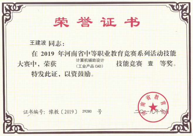 根据河南省教育厅《关于开展2019年河南省中等职业教育竞赛系列活动的通知 》(教职成〔2019〕130号),河南省中等职业教育技能大赛组委会办公室组织制订了“2019年河南省中等职业教育技能大赛全员化试点项目比赛方案”,我校全体师生积极准备比赛活动,我校学生在辅导老师的带领下,制定比赛训练方案,组织实施训练。从学校的全员比赛到济源市的技能大赛,最终选拨出优秀的师生参加全省的职业教育技能大赛。在10月份刚刚结束的河南省中等职业教育技能大赛中,我校教师王建波在计算机辅助设计(工业产品CAD)教师组比赛中获得壹等奖。